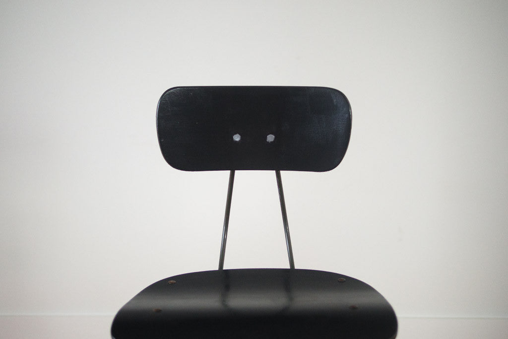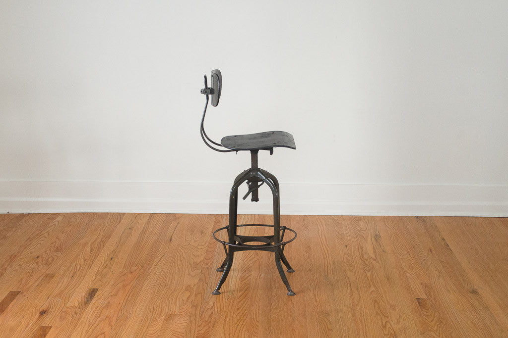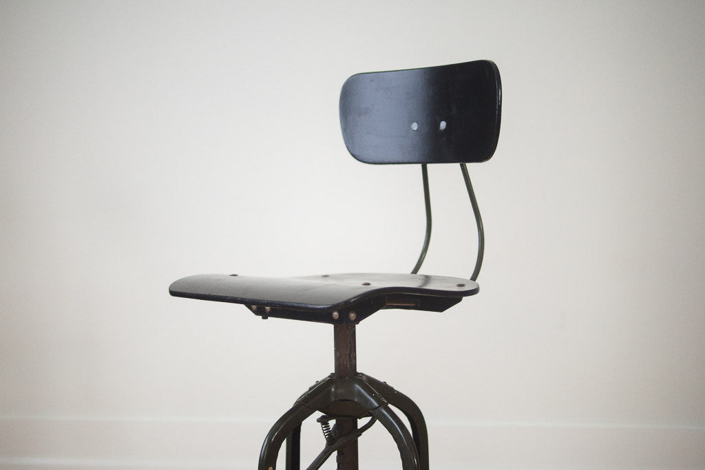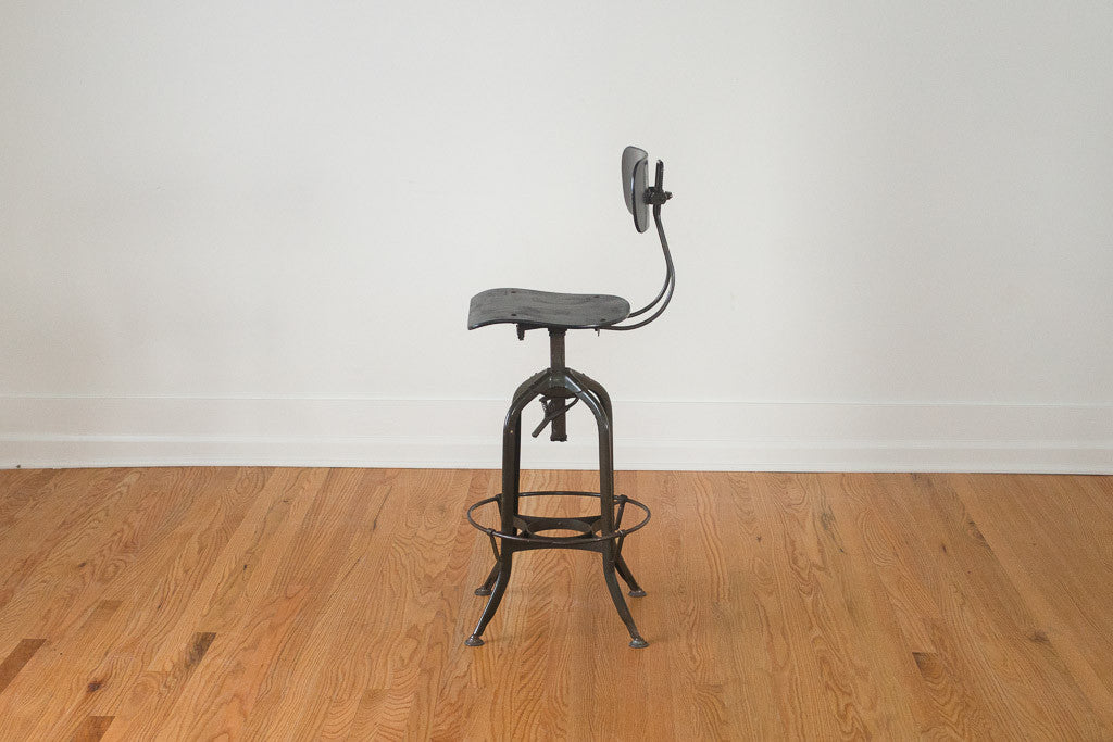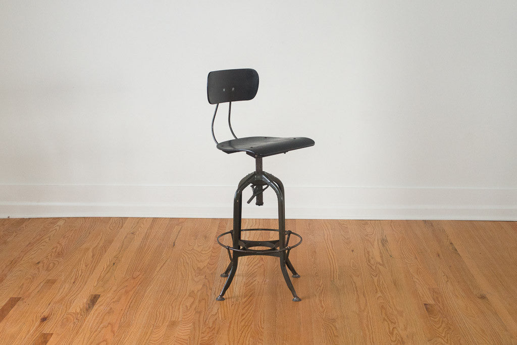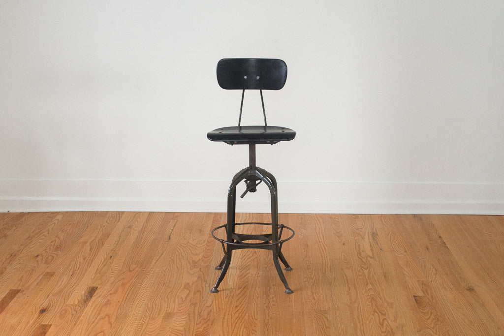We have a custom painted vintage industrial draftsman's stool in our shop. This chair is an original UHL Steel stool manufactured by The Toledo Metal Furniture Company in Toledo, OH. The back rest is adjustable in height along with an adjustable seat height so you can make this chair fit you perfectly no matter what your preference is. The wood seat and back rest had been painted with a terrible faux marble pattern so we decided to go Restoration Hardware/French Industrial with it and paint them semi-gloss black. The steel base is in original condition with great patina and character. We have two Toledo stools at our kitchen island and we love them. This chair would also be great at a drafting table desk.