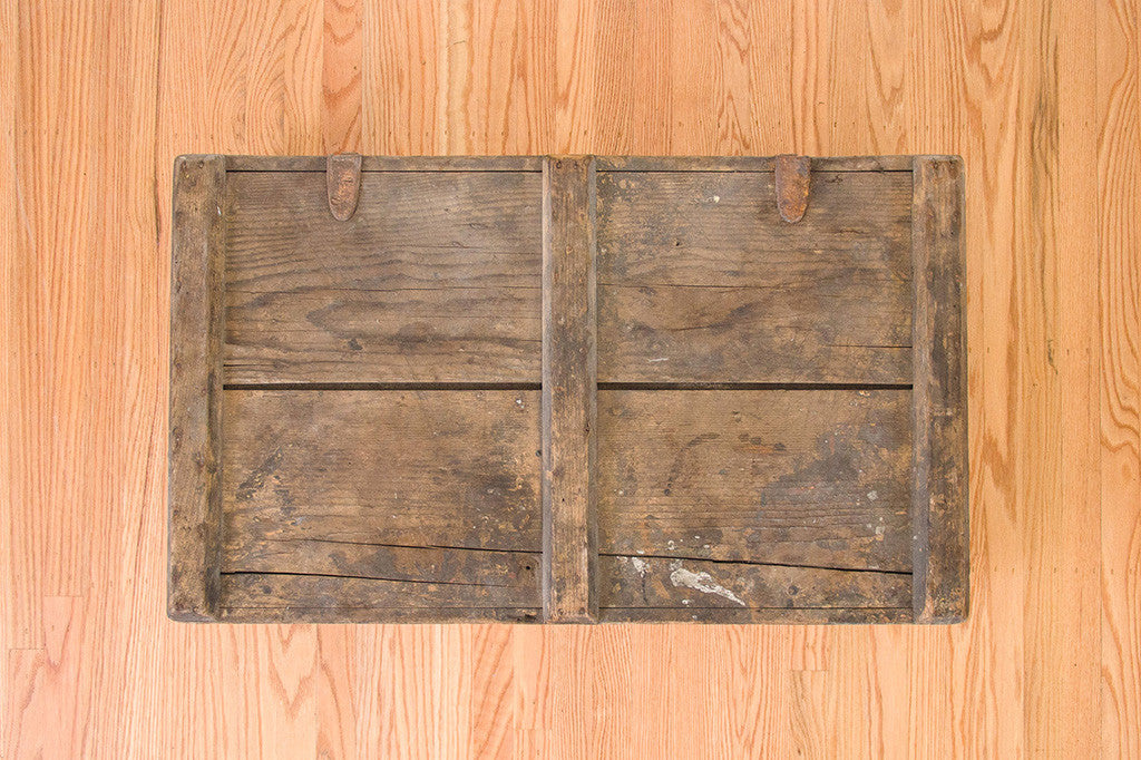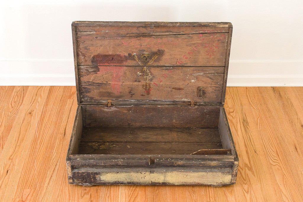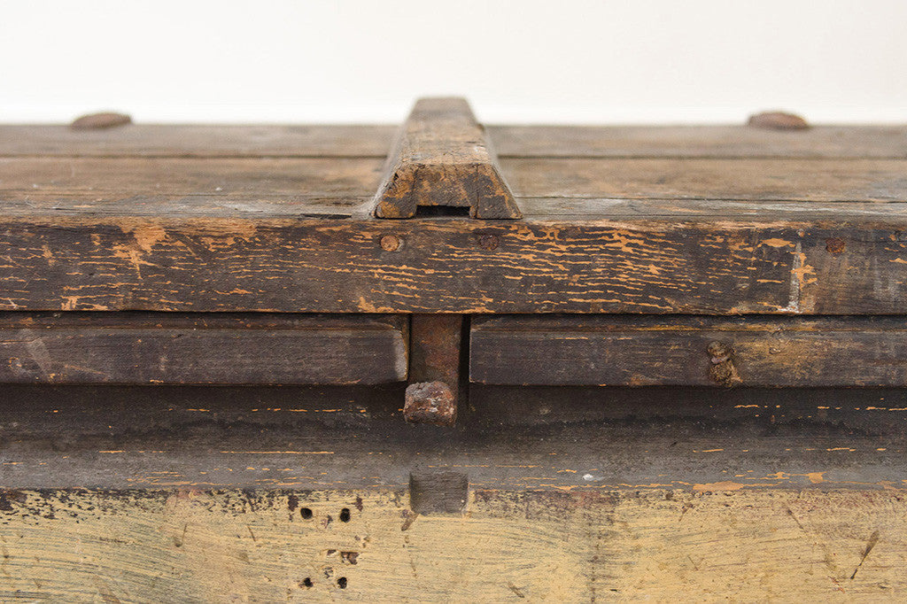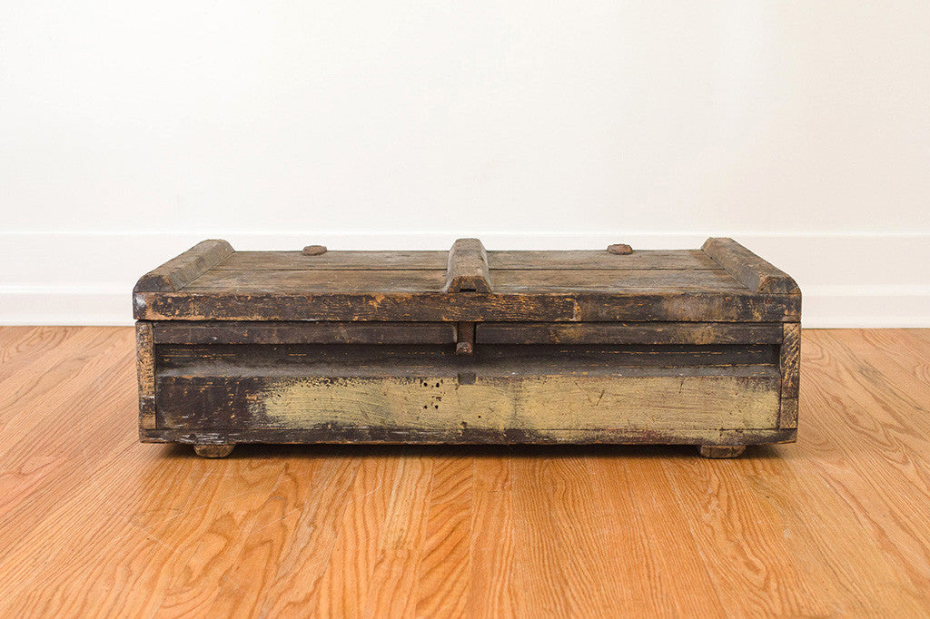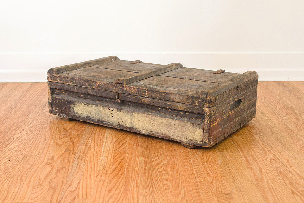 This antique wood tool chest has a nicely distressed patina and rustic metal hardware. It's in good functioning shape and would make a great coffee table or end of the bed storage piece. Please see pictures for detailed condition of this piece.