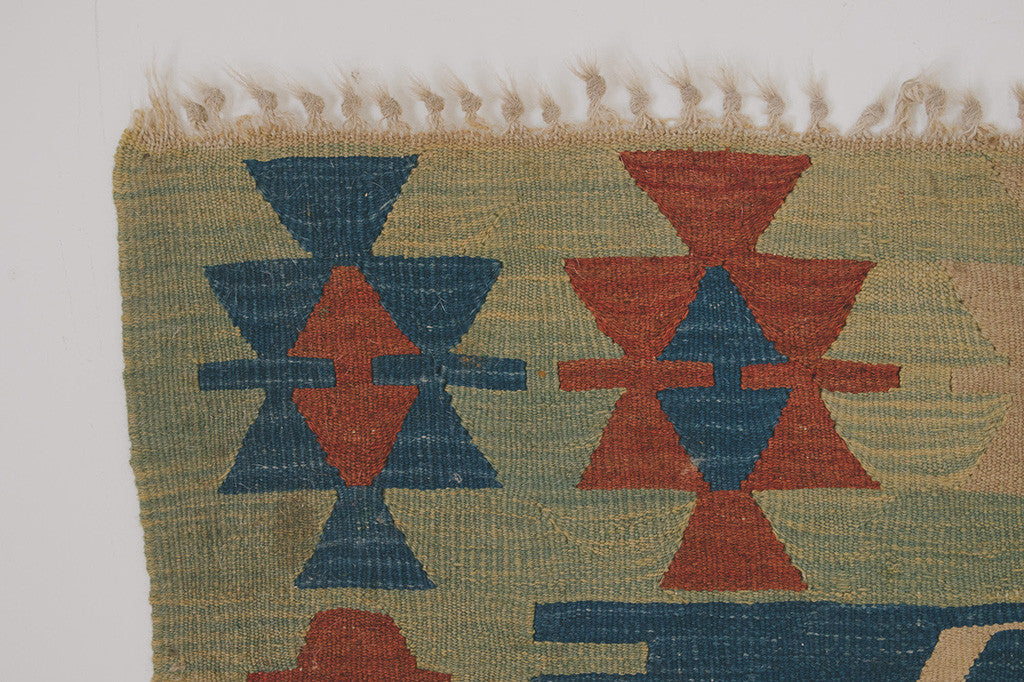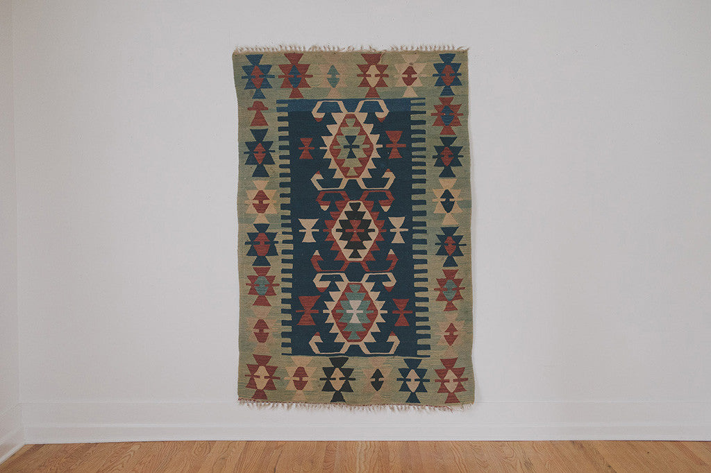 This vintage handwoven kilim rug has a blue-green base with navy, red and cream accents and tan fringe. It's in good shape with age related wear. Please see pictures for detailed condition.