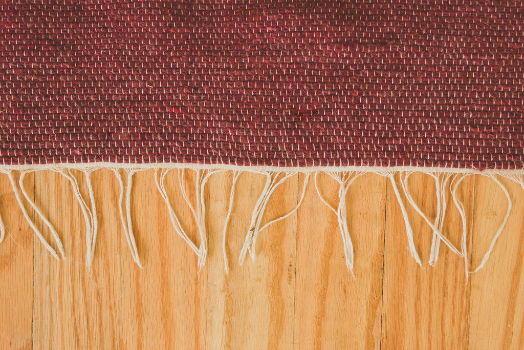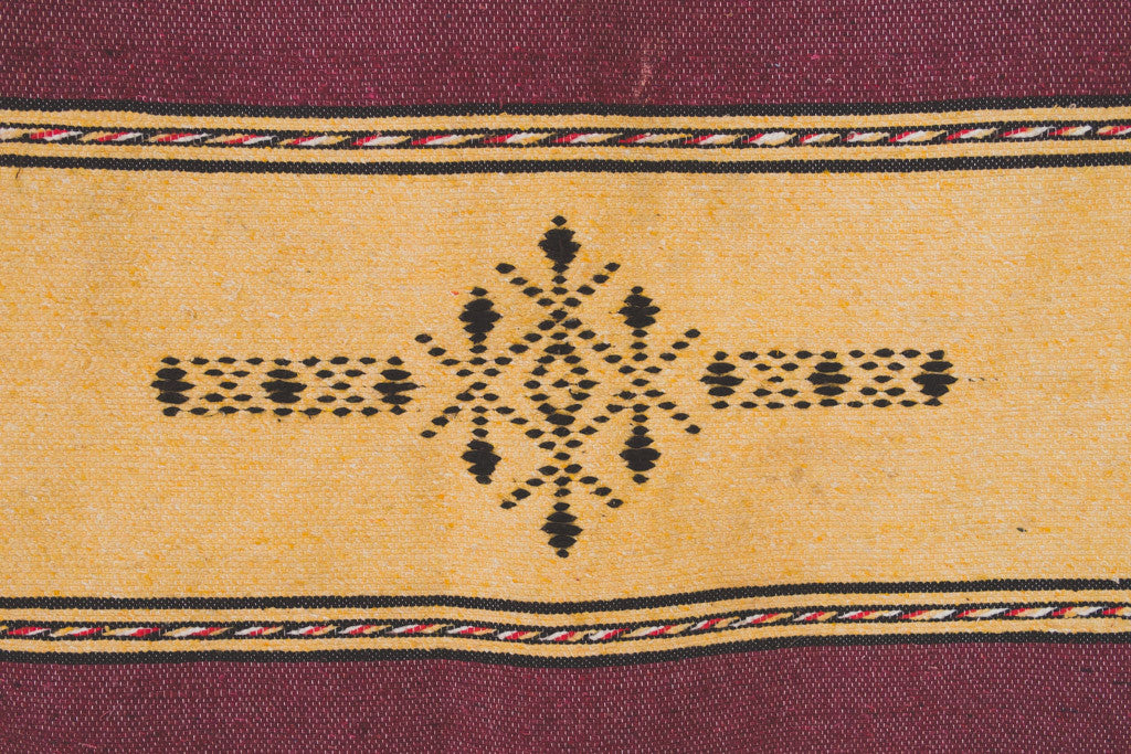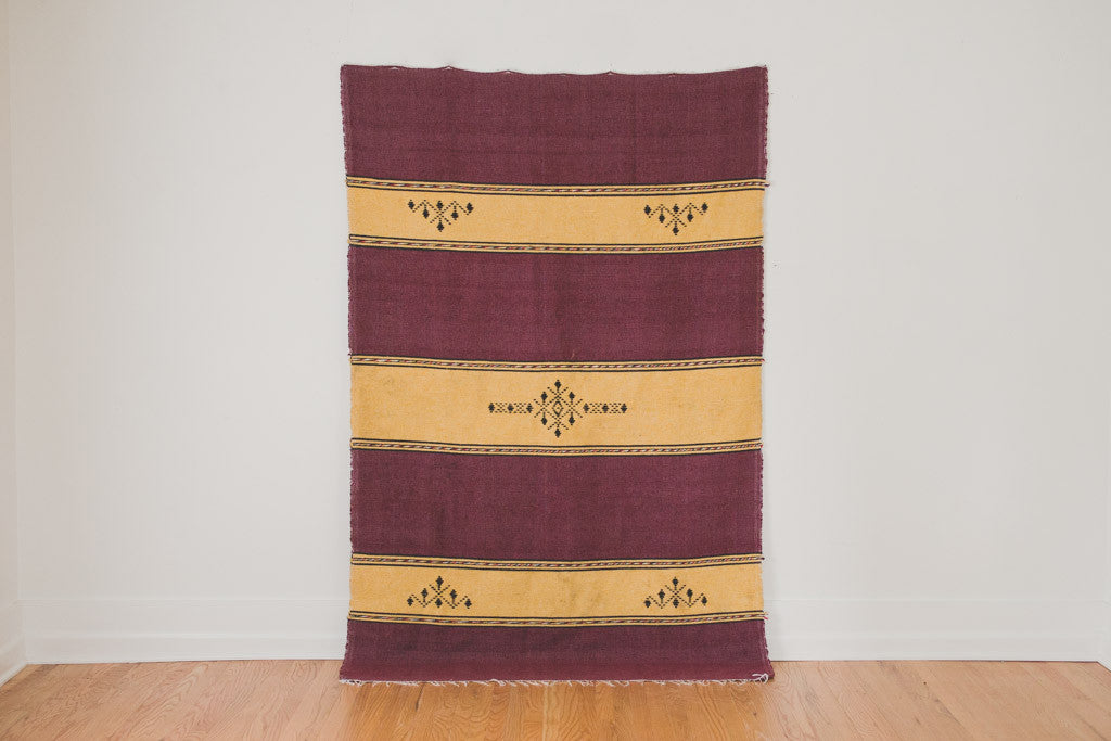 This vintage kilim style wool tapestry has a burgundy and yellow base with white fringe and black, white and red accents. It's in great shape with some age related wear and could also be used as a rug or blanket. Please see pictures for detailed condition.