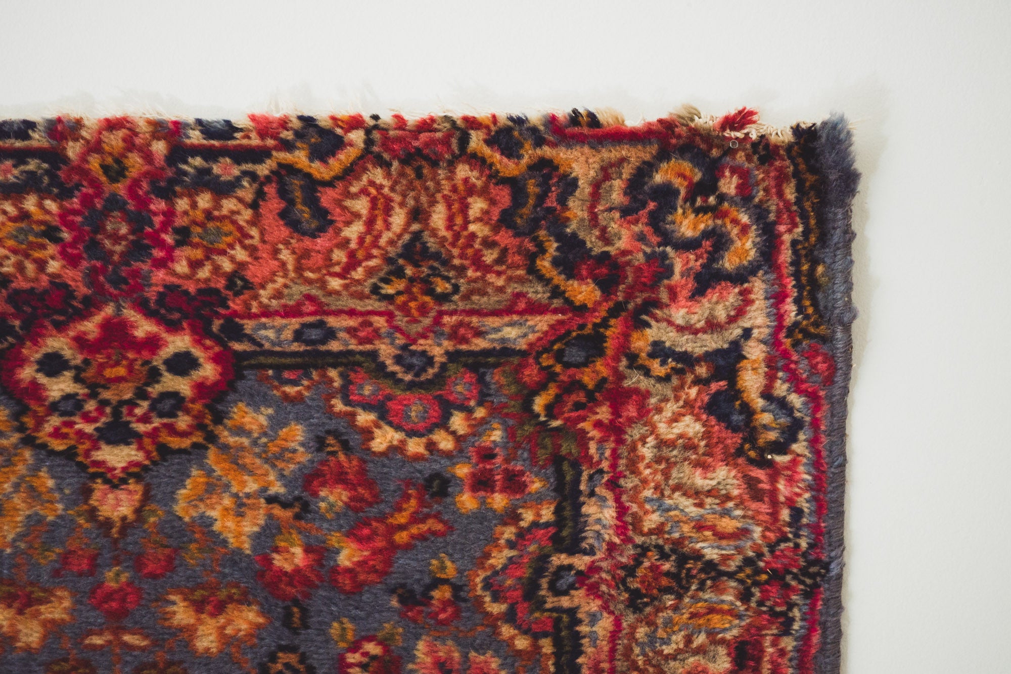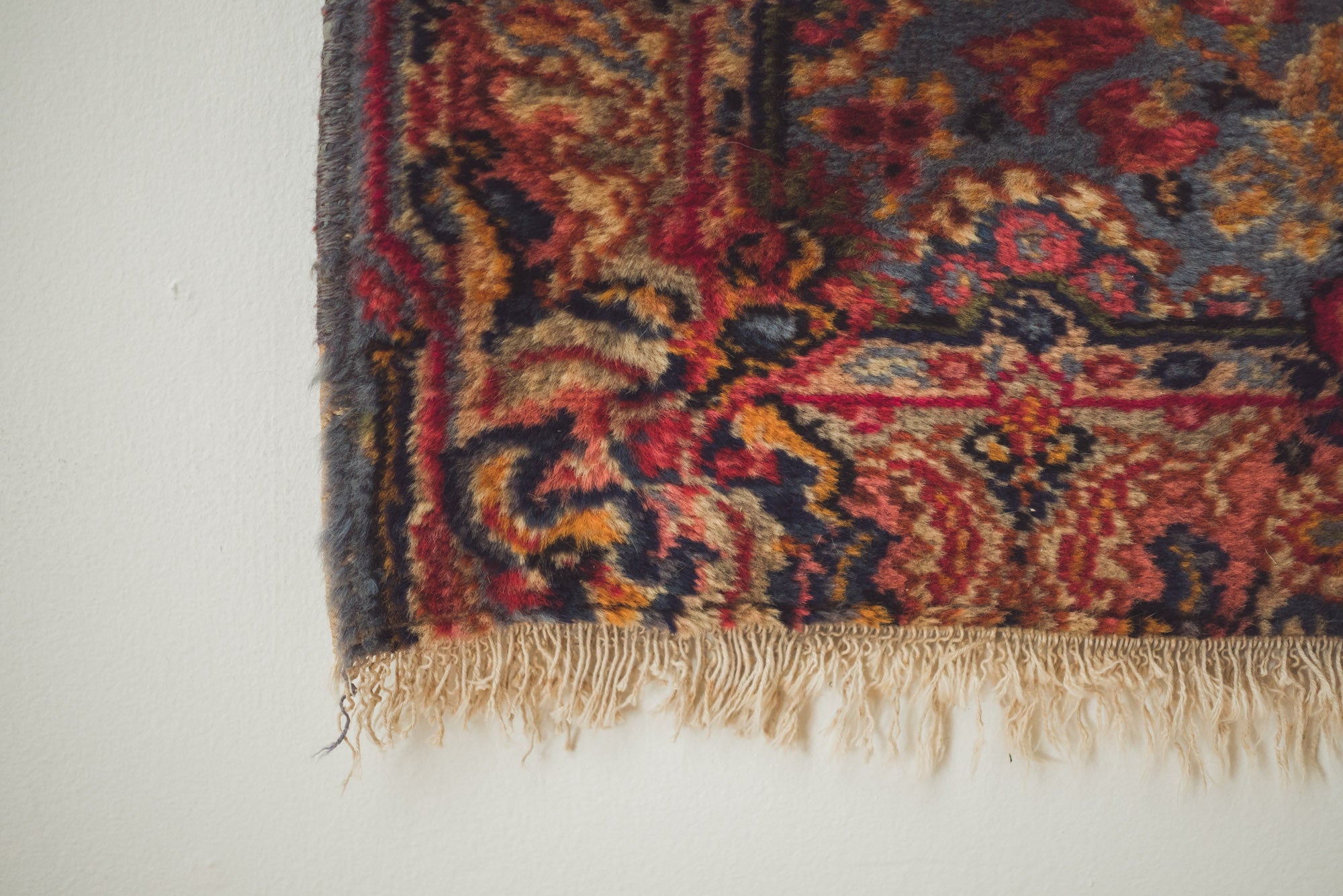 This vintage wool rug has a blue base with pink, yellow, brown and cream accents. It's in good overall shape with age related wear. See pictures for detailed condition.