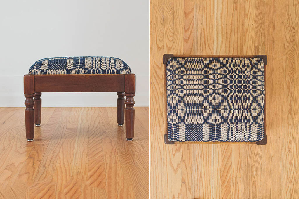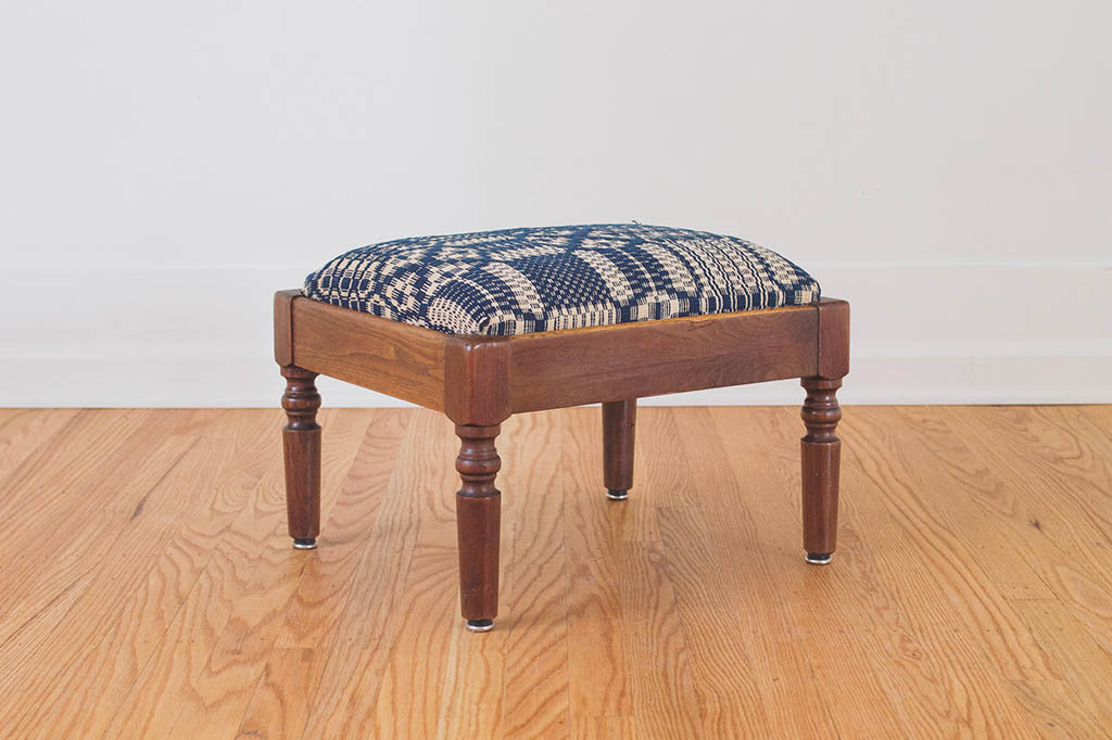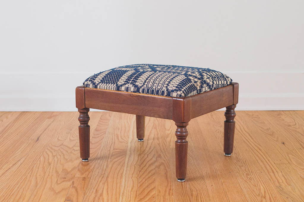 This vintage ottoman is upholstered in an antique navy and tan woven fabric with a carved oak frame. It's in good shape with age related wear. Please see pictures for detailed condition.