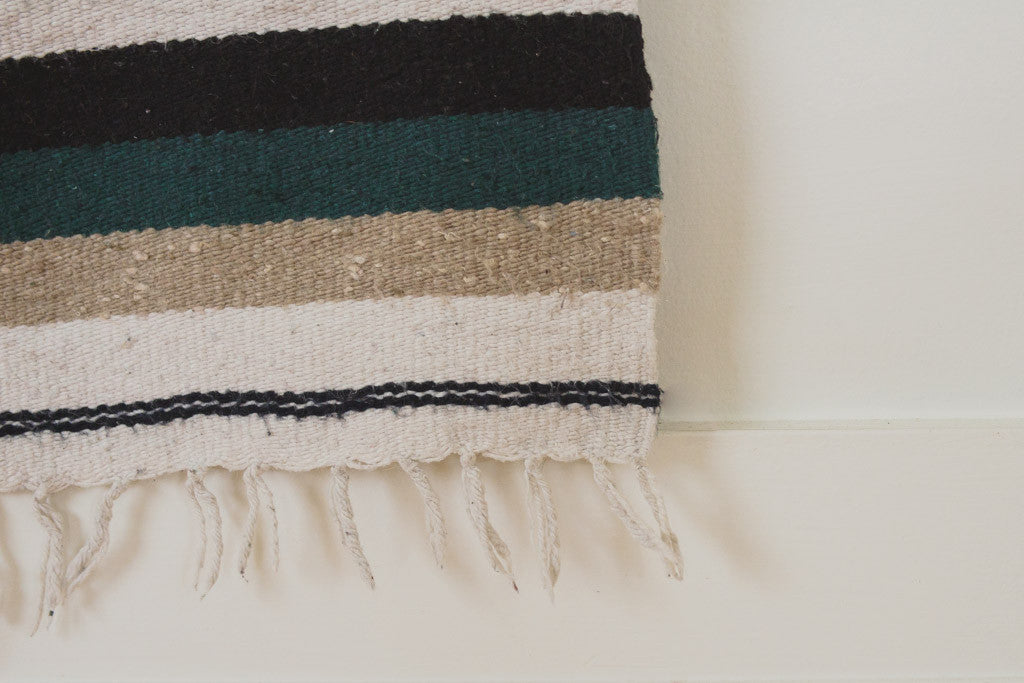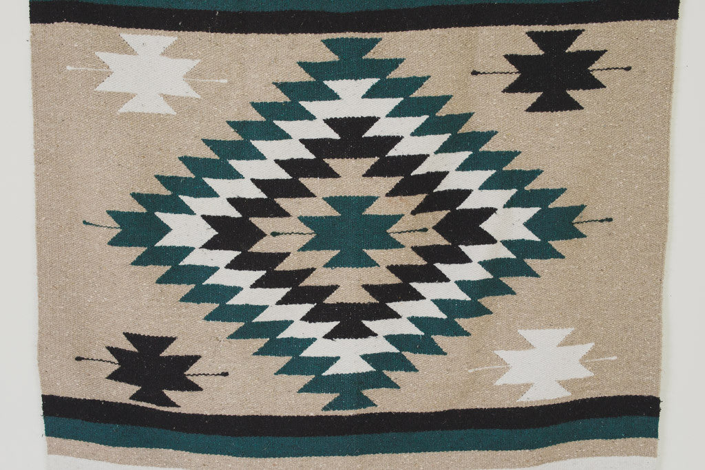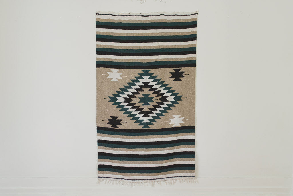 This Mid Century woven tapestry has a tan base with black, green and white kilim design and cream fringe. It's in good shape with age related wear. Please see pictures for detailed condition.