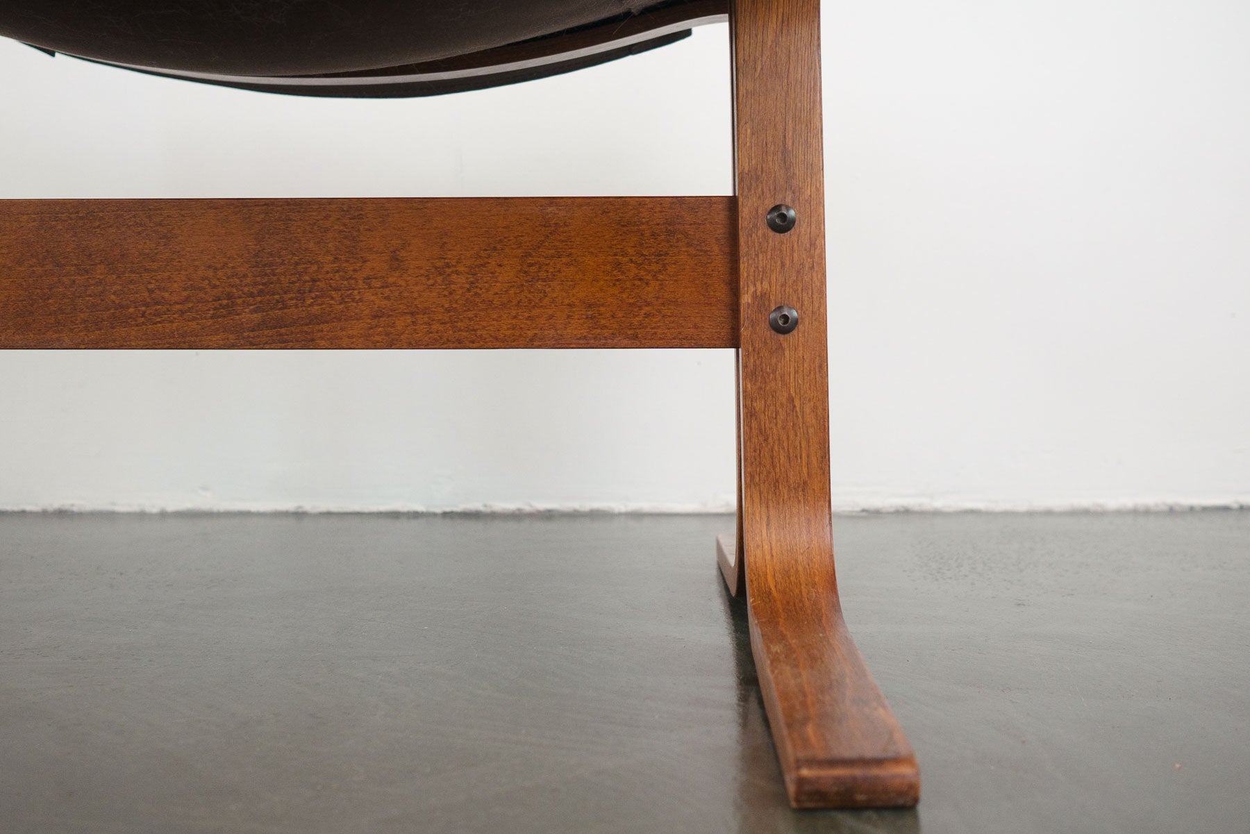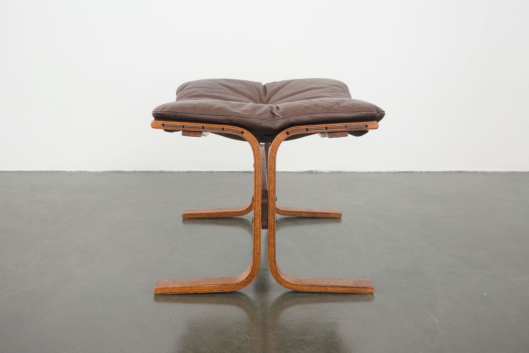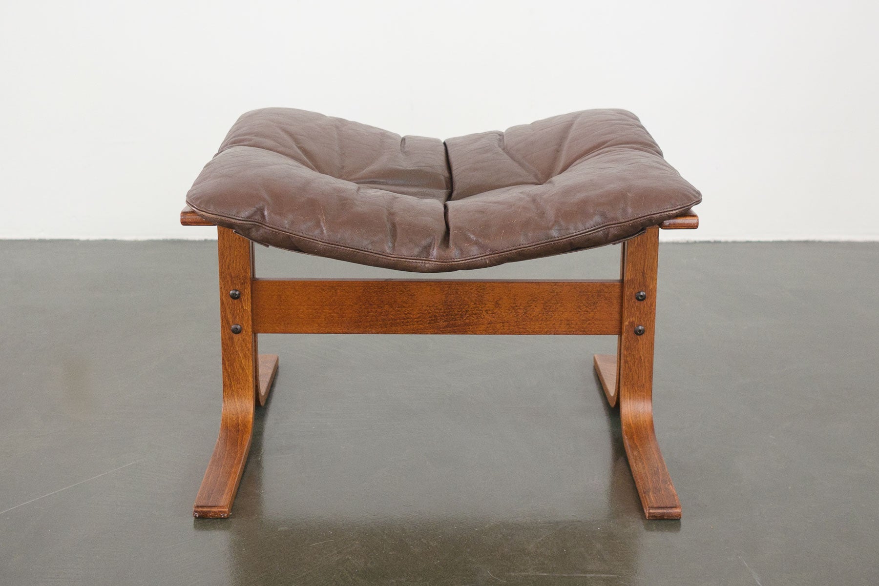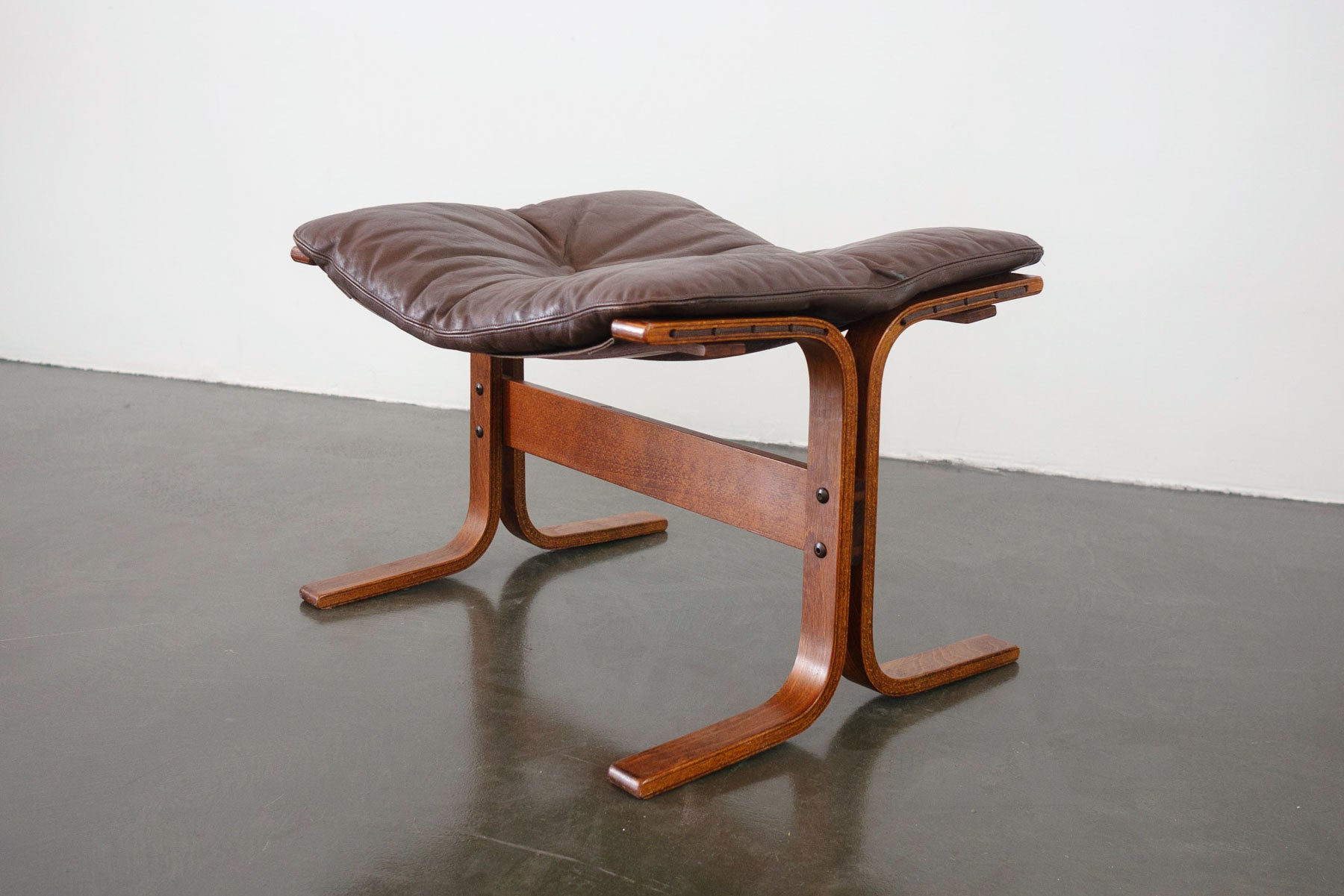 style: modern, tufted, bentwood, sling, ottomanmaterial: wood (rosewood), leather (brown), canvas, ropebrand: Westnofa, Siestaage: vintage, Mid Centurycondition: good, age related wear - see pictures 25" wide x 21" deep x 18" high