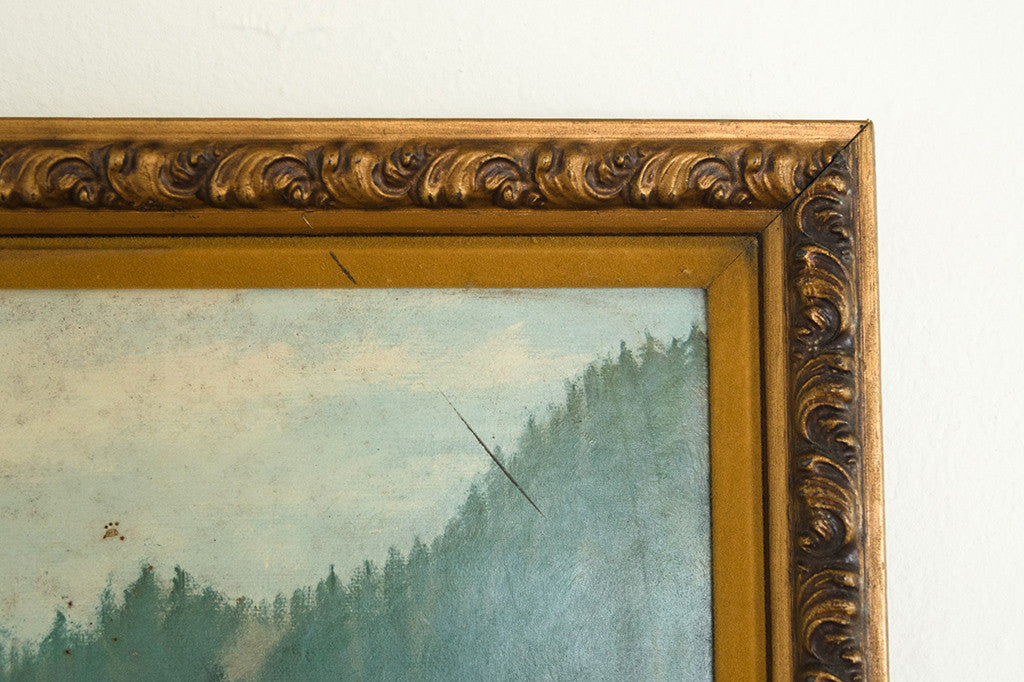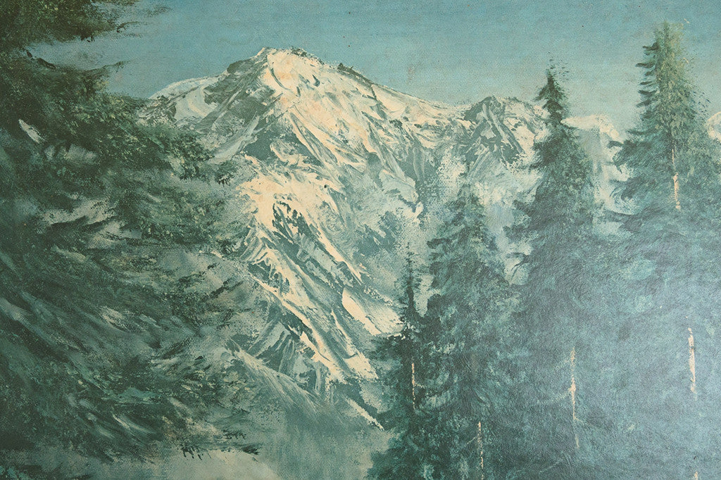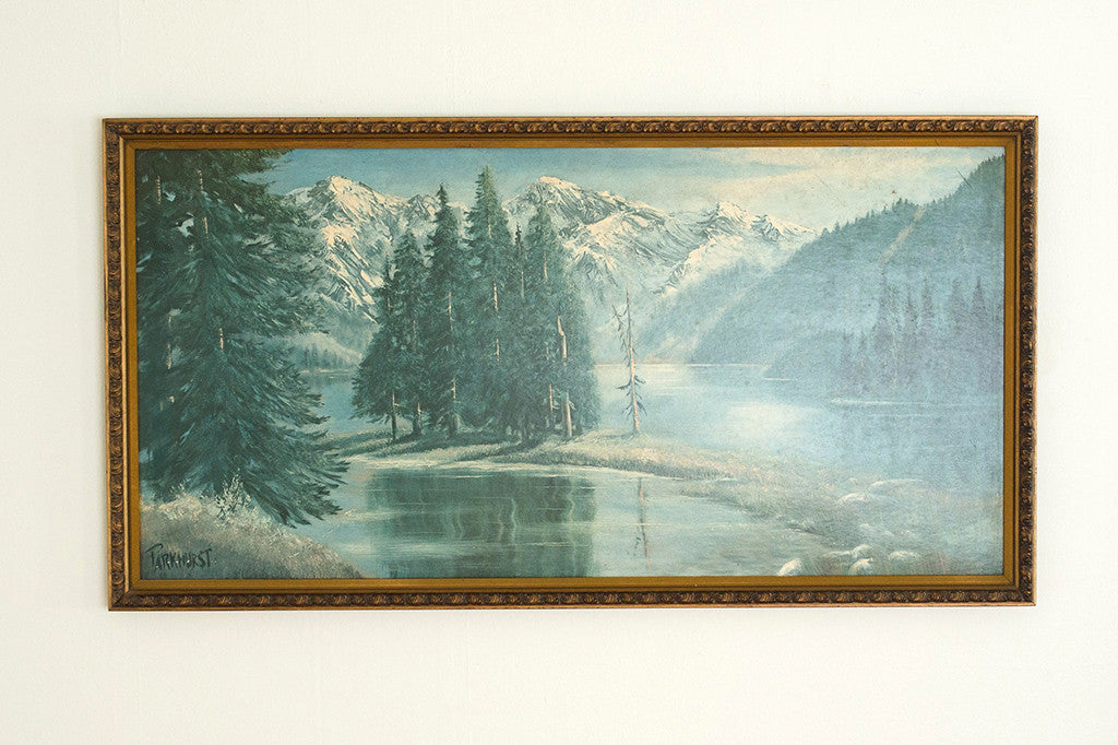 This vintage forest print is large scale with a gold painted frame. It features a winter scene with evergreens, snow-capped mountain and clear blue lake. It's in good overall shape with some distressing and marks throughout.