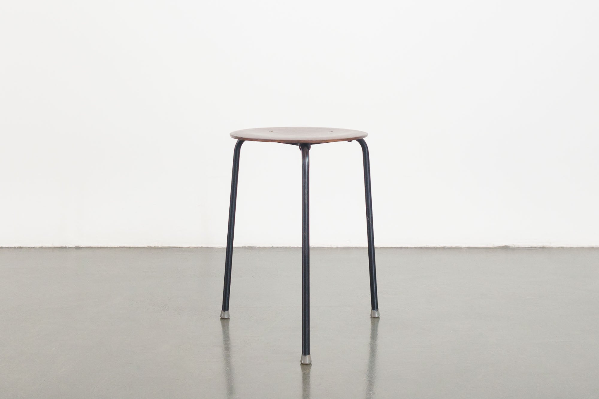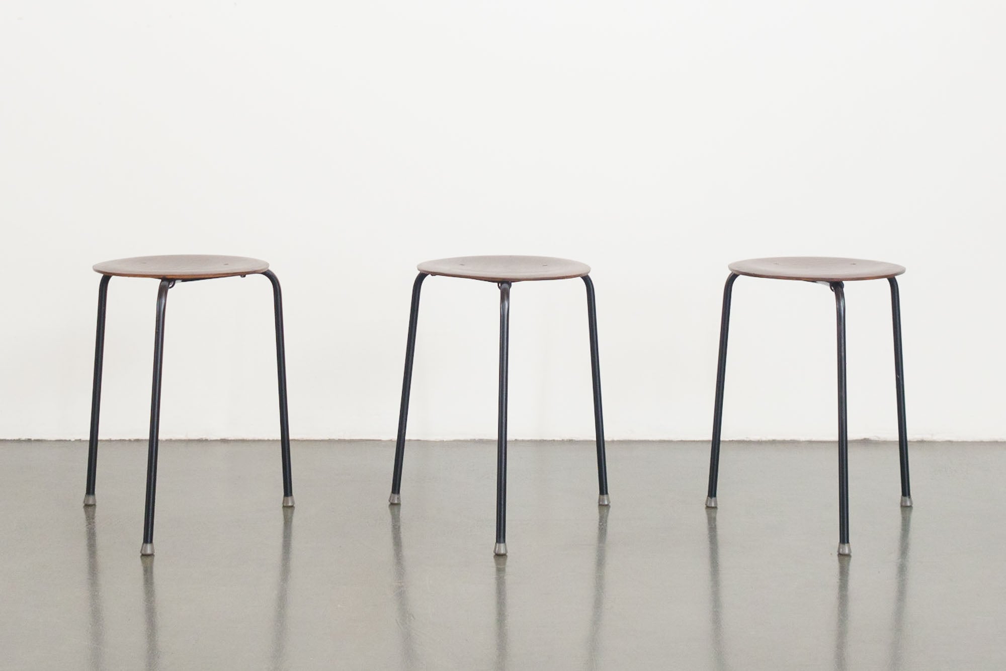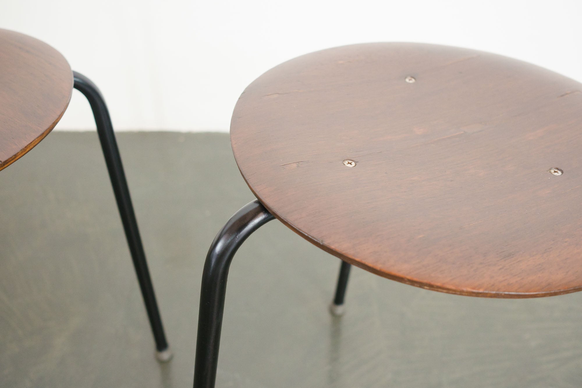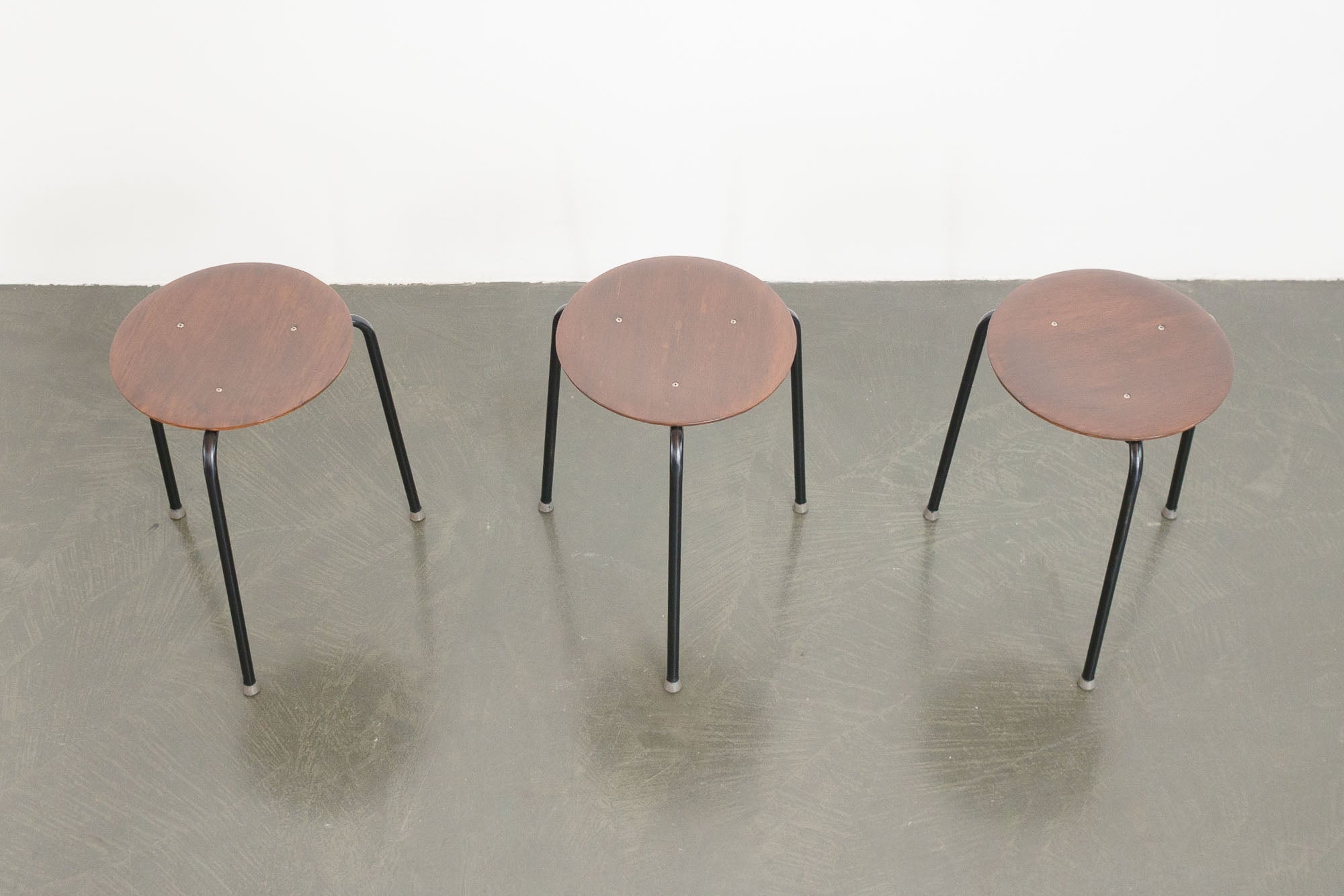 style: set of 3, stacking, round, stools material: wood, metal designer: Arne Jacobsen age: vintage, Mid Century condition: good, age related wear - see pictures other: priced as a set