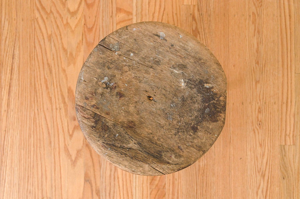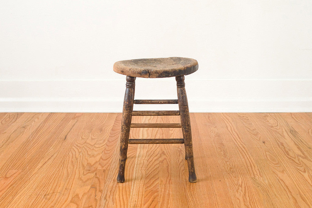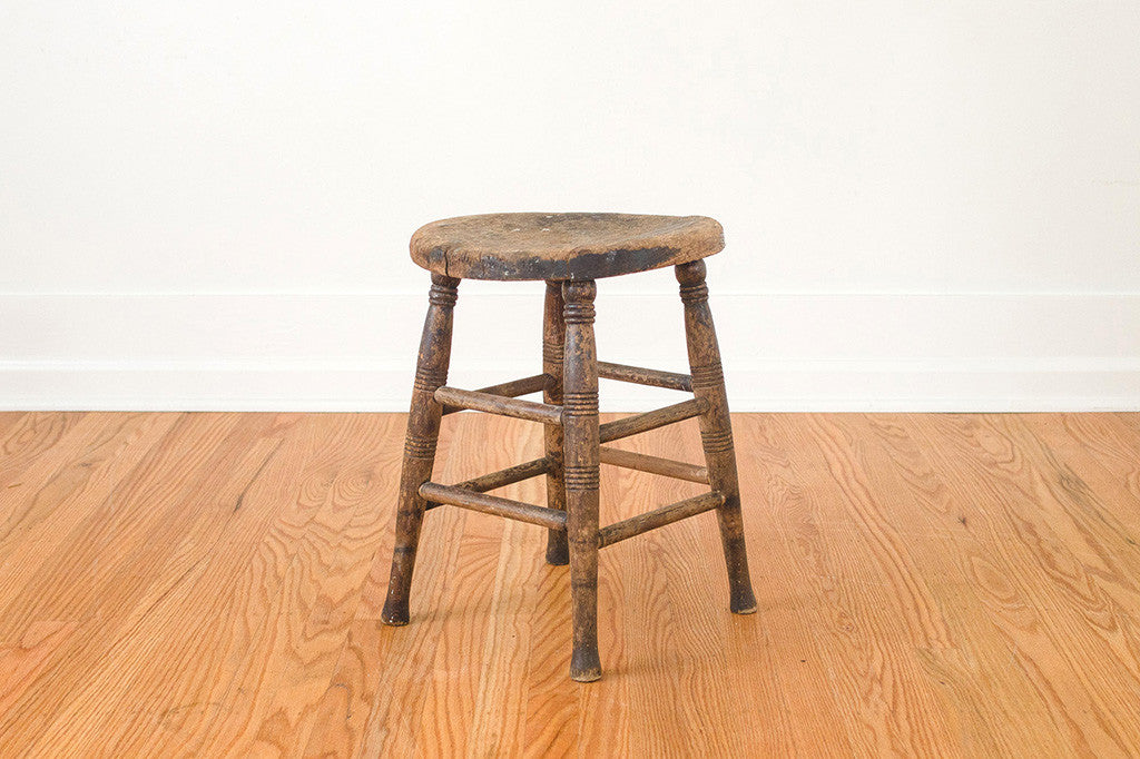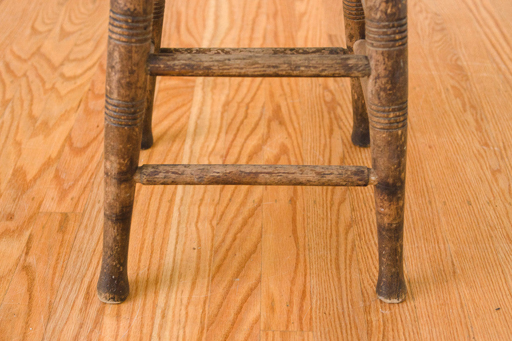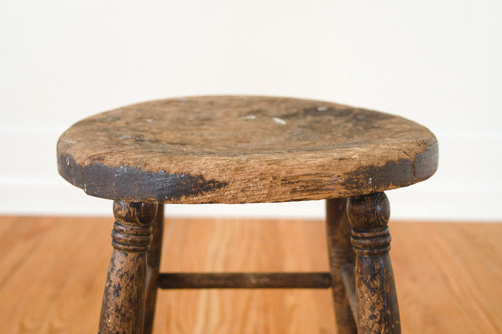 This primitive, dark wood farmhouse stool would be perfect to use as intended, but would also make a great side table or plant stand. It's in good overall shape with a nice rustic patina. Please see pictures for detailed condition of this piece.