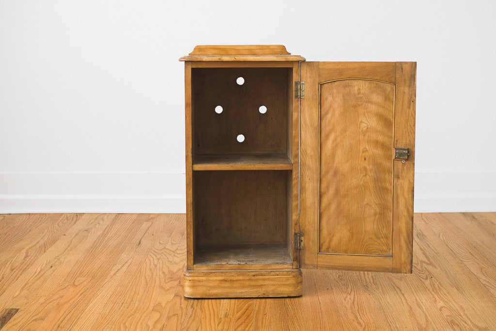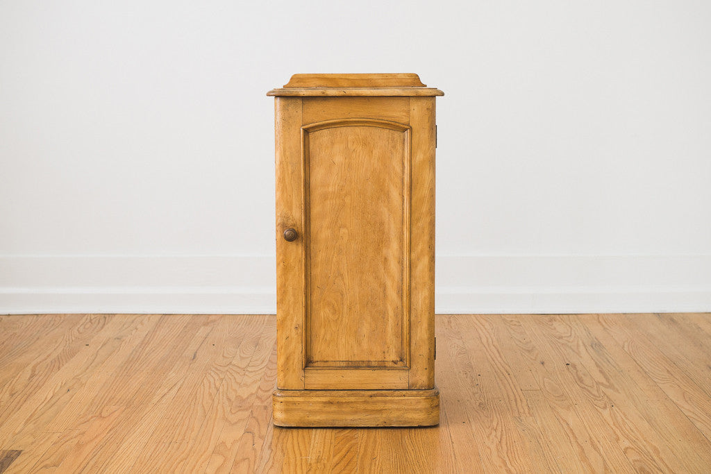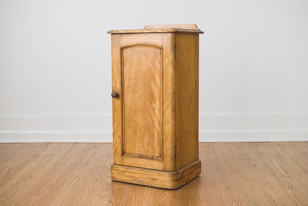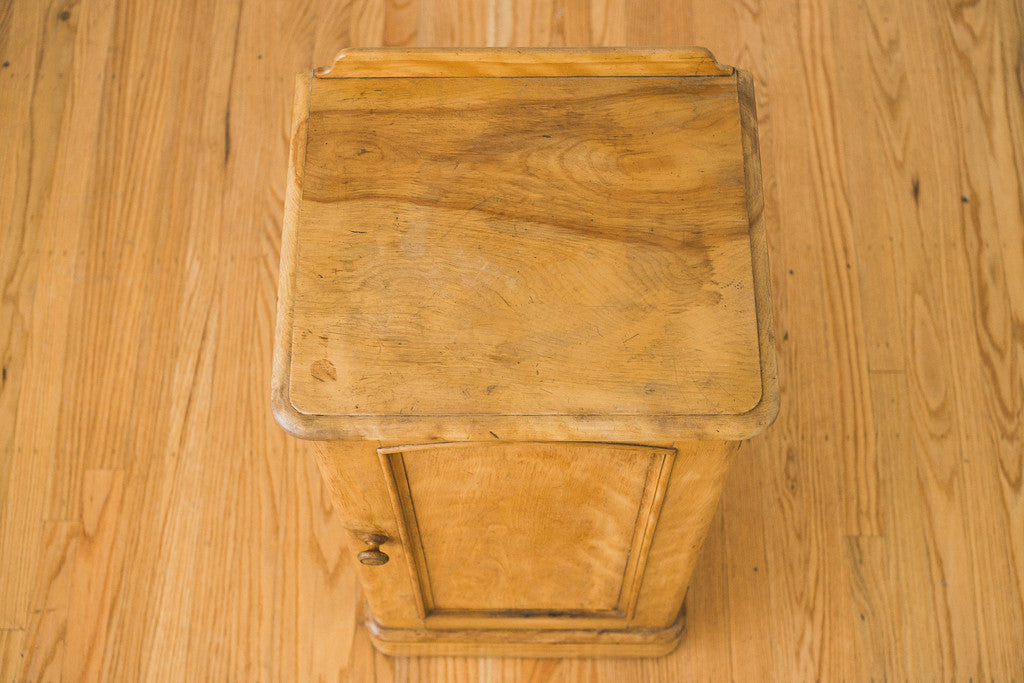 This vintage nightstand has split shelving behind a single door. It's in good shape with age related wear and could also be used as a plant stand, side table or cabinet. See pictures for detailed condition.