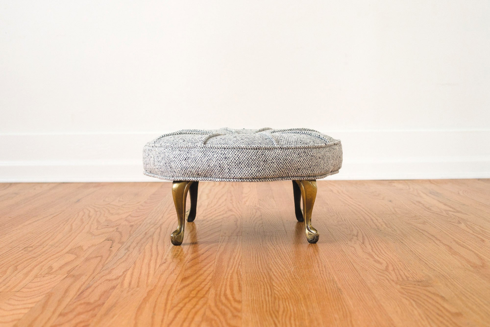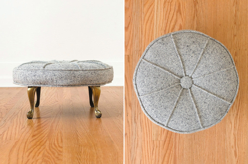 This vintage brass-legged ottoman was reupholstered in grey tweed wool. The design of the piping makes this a really special piece. It's in overall great shape with some light age related wear to the legs. Please see pictures for detailed condition of this piece.
