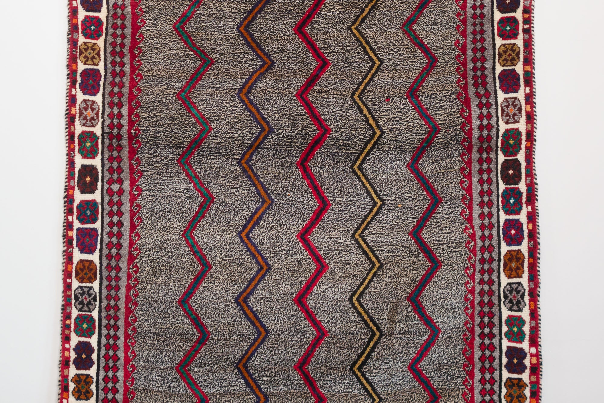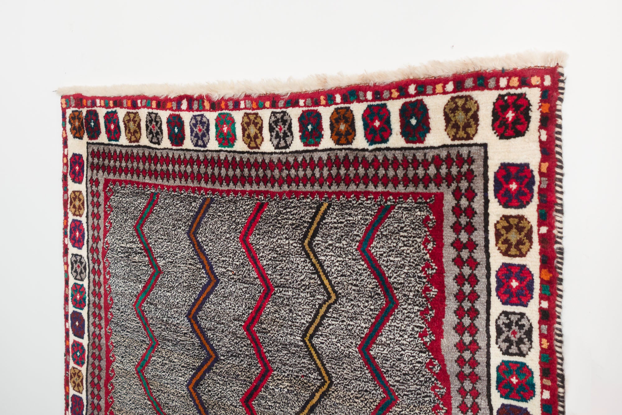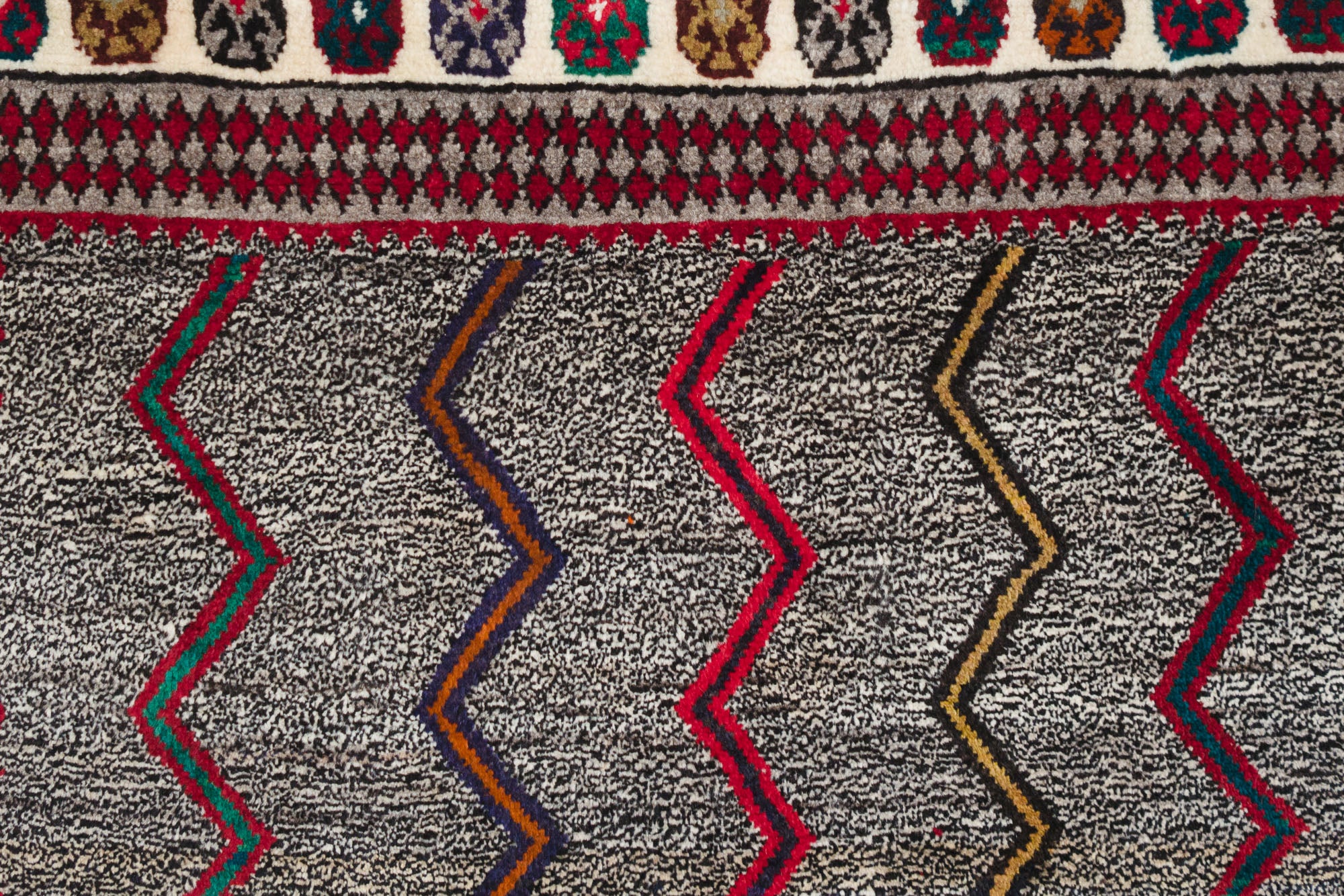 name: Nouzarorigin: Iran (Persian)style: gabbeh, rug, carpetmaterial: hand knotted woolcolors: gray, black, red, cream, yellow, green, blueage: vintage, 1940-1970condition: good, age related wear - see picturesappraised value: $1275sku: p-1104