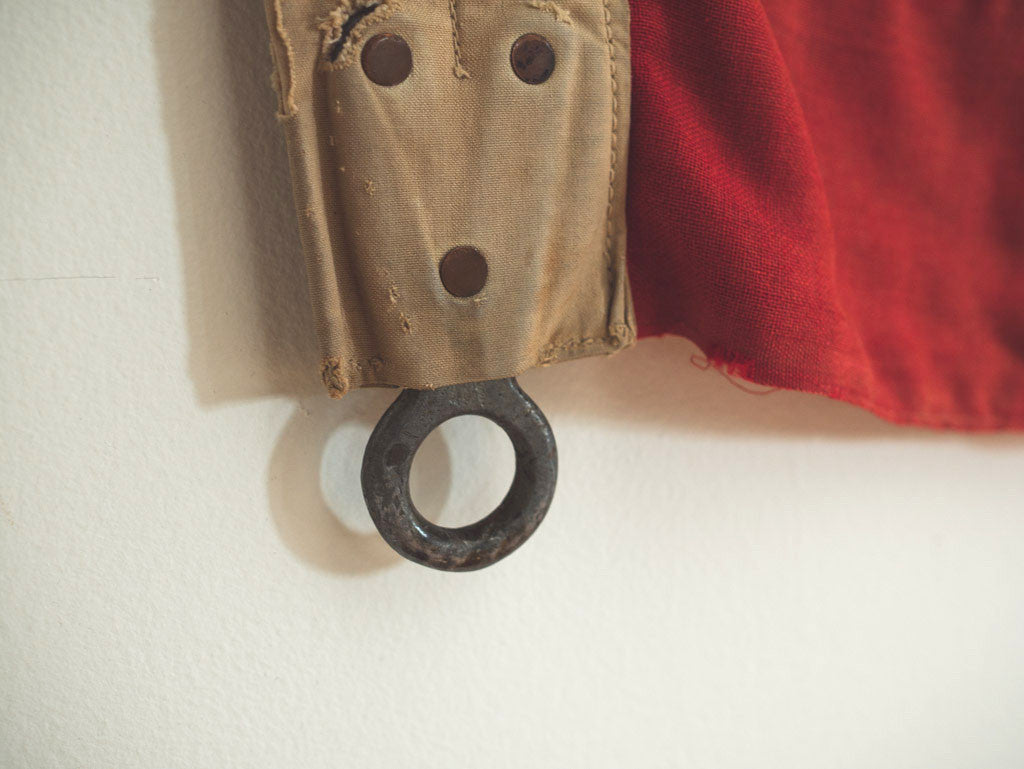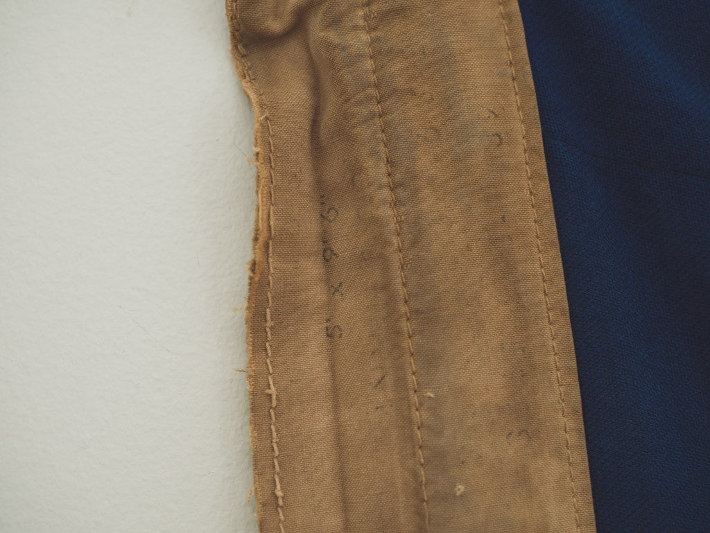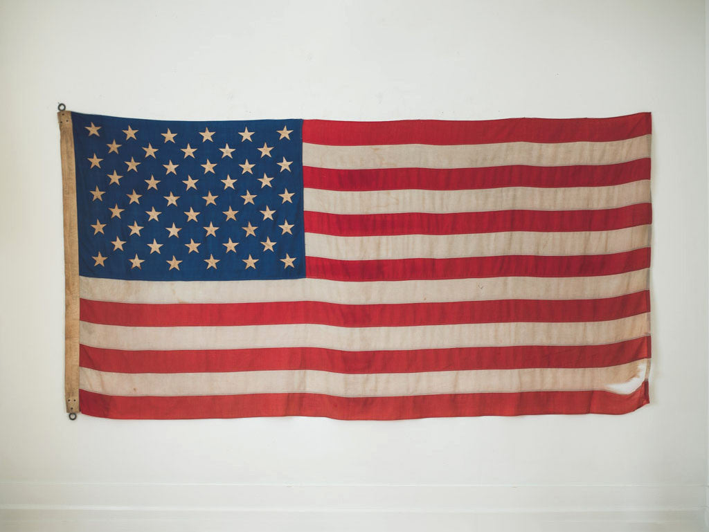 This vintage American flag has all stars and faded coloring from age. It has two metal grommets and is in good overall shape with age related distressing and wear. See pictures for detailed condition.