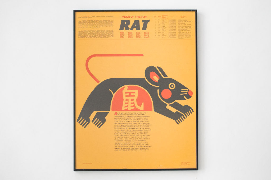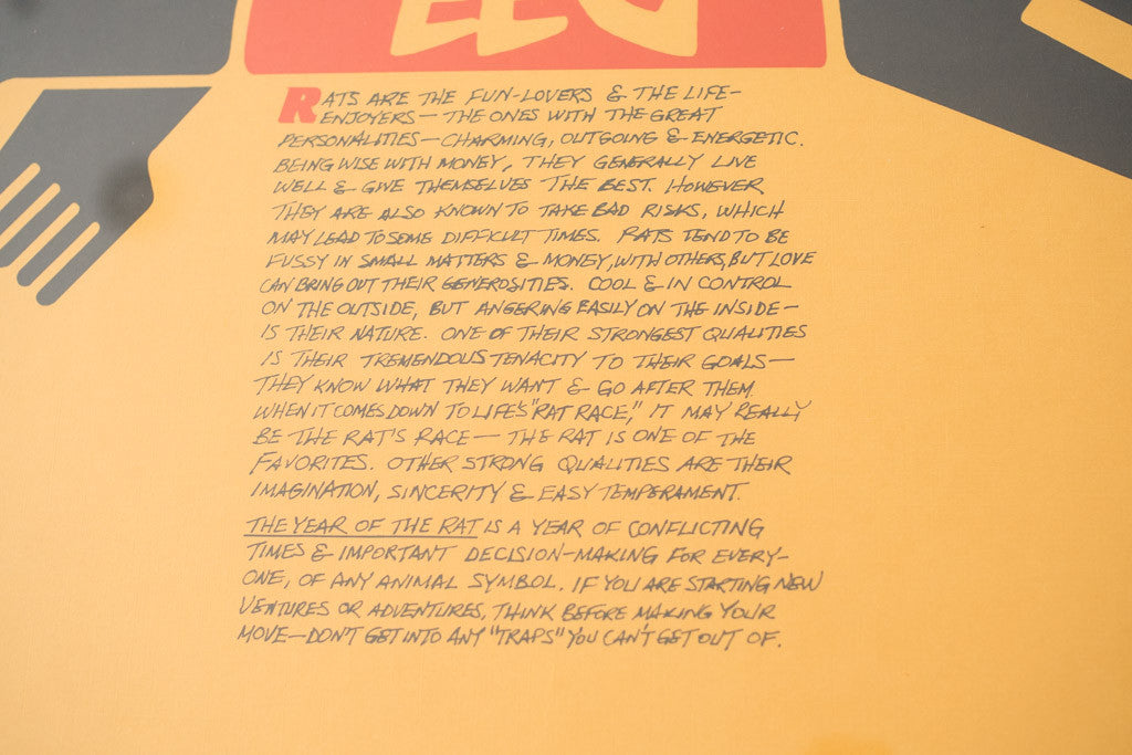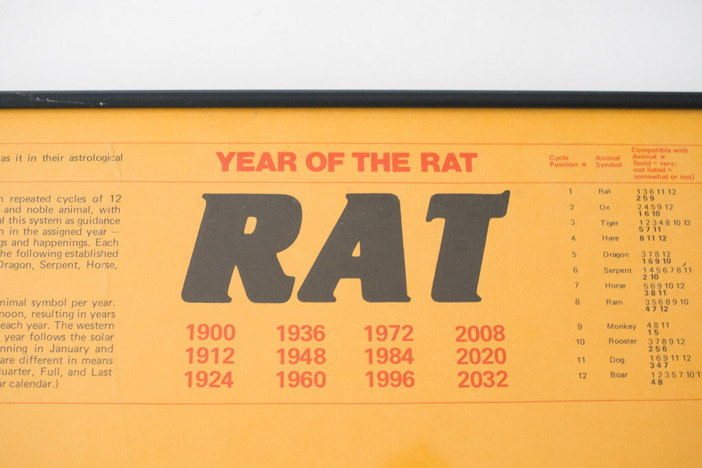 style: framed, modern, abstract, art, poster, Chinese zodiac material: glass, paper, metal text: Year of the Rat age: vintage 1984 condition: good, age related wear - see pictures