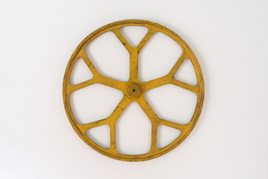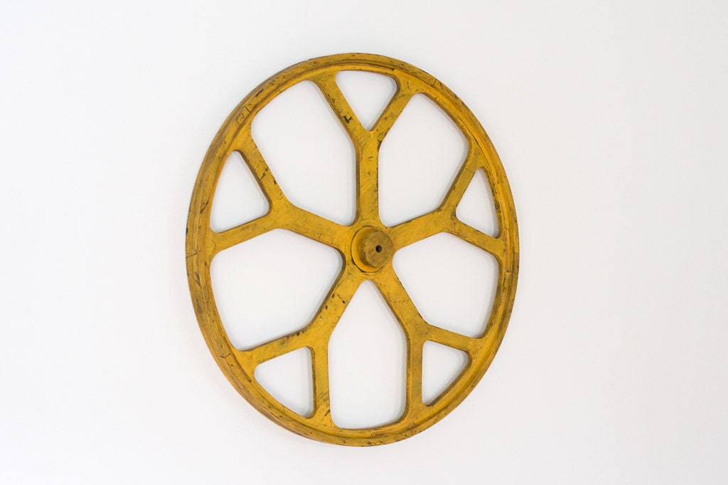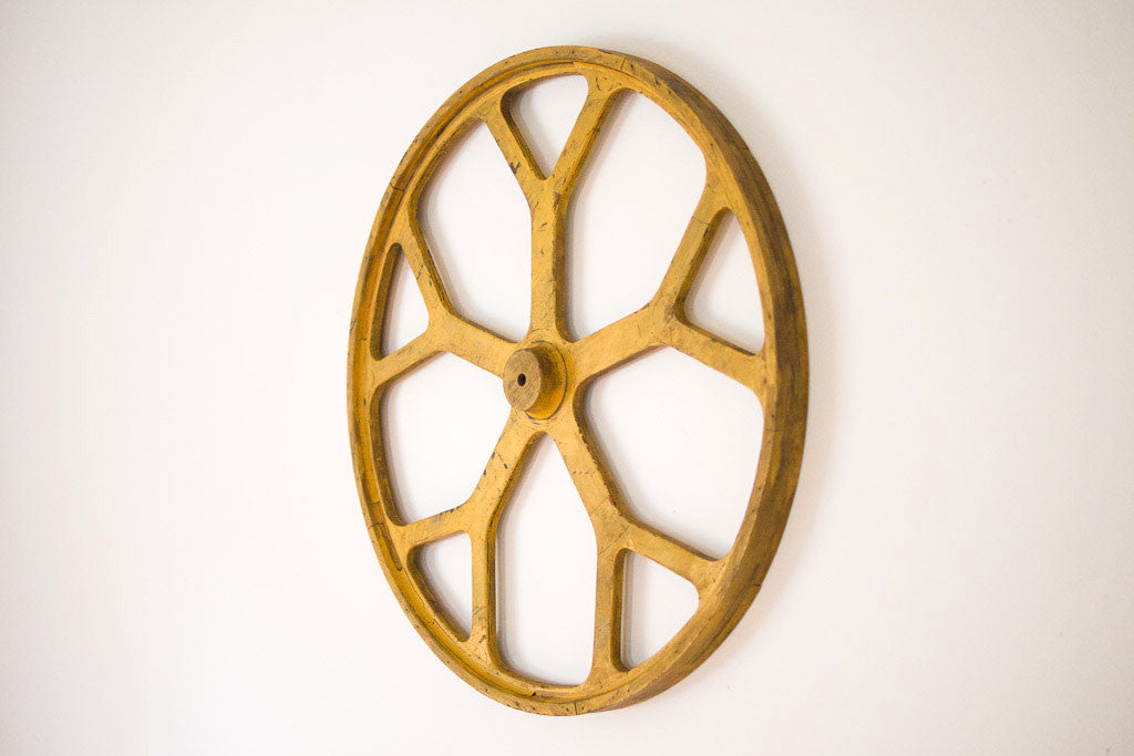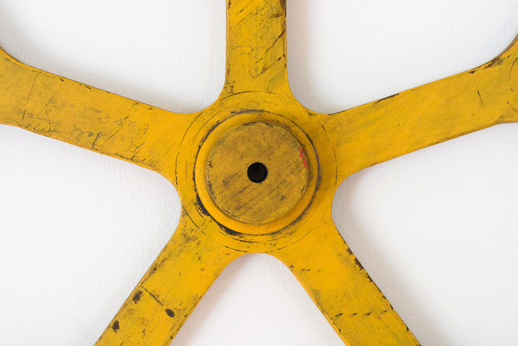 This rustic wagon wheel has chippy yellow paint that is still very vibrant. It adds a great pop of color to any room. It would look good hanging anywhere from an industrial loft to a kids room.
